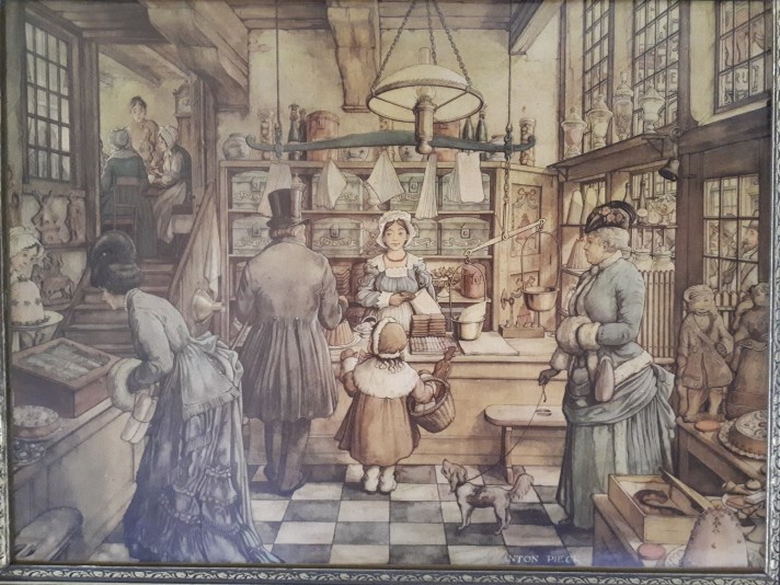 Painting on my library wall of a Dutch bakery. My grandparents brought this cardboard print with them when immigrating from Holland after World War II. By Anton Franciscus Pieck (19 April 1895 – 24 November 1987). My grandfather and great-grandfather were bakers.