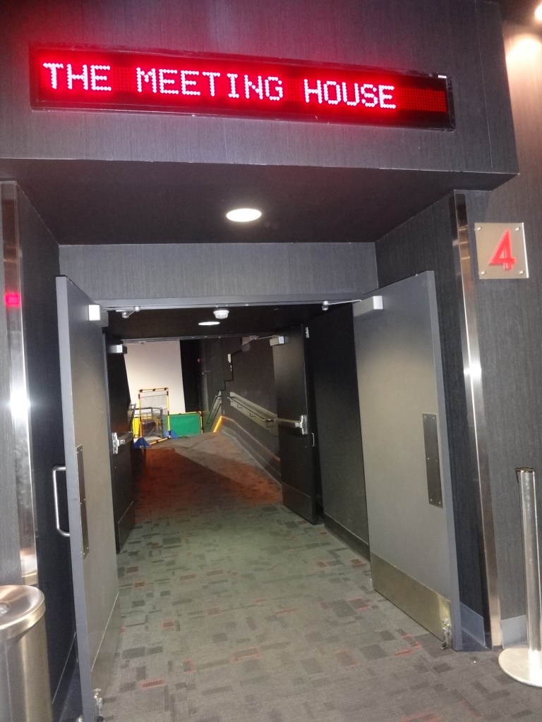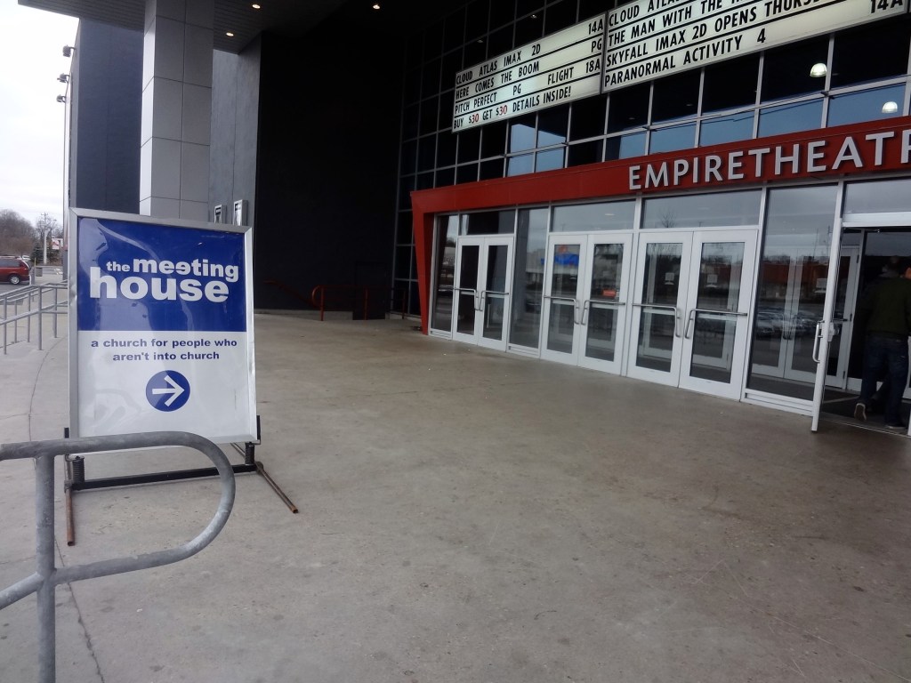 Of the 18 or so remote sites where The Meeting House rents space, all but one were movie theatres. Theatres are the home of drama, mystery, celebrity, and where new worlds are brought into being by light. This demonstrates how church—all churches, but this one in particular—can be a show. This is part of my “dramaturgical analysis” in my book.