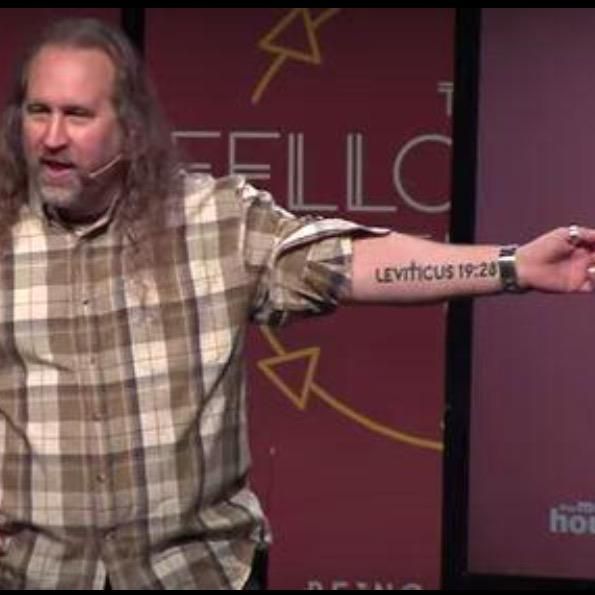 Here Bruxy Cavey shows his tattoo of a Bible text that says, “Don’t tattoo yourselves.” In a nutshell, this demonstrates both Cavey’s preferred ironic approach to faith, and his theology of discontinuity between Testaments of the Bible.