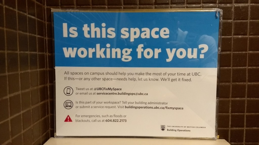 Here are two photos I took on campus that illustrate how the neoliberal university encourages students to think about their entitlement and implicitly sanctions their consumeristic goals. The first is in the bathroom. I don’t mean to criticize the efforts to provide adequate facilities or to erect structures of accountability in the use of students’ fees, but I do want to criticize the assumption that satisfying students’ wants is all the university is for. In such a situation, a university presents itself in almost the same way as does any company that produces advertisements. There isn’t any sense of being part of a larger pursuit, such as wisdom or love, that transcends my desire for immediate comfort.