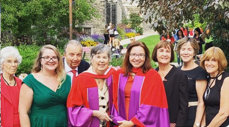 Honorary Doctorate Celebration, Victoria University, 19 September 2019: From Left: Aunt Alice, Niece Christy, Husband Walter, Ruth, Katharine, Sister Alice, Sister Louise, and Sister Elizabeth. Photo courtesy of Ruth Hayhoe.