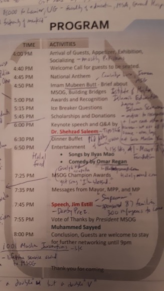 The evening’s program. Note the singing of the Canadian national anthem, the comedian, and messages from the Mayor, MPP, and MP.
