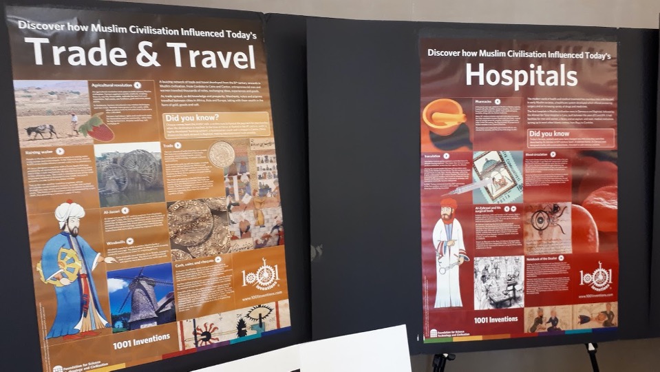 Numerous posters filled the hallway, explaining the contributions of Muslims to human civilization.