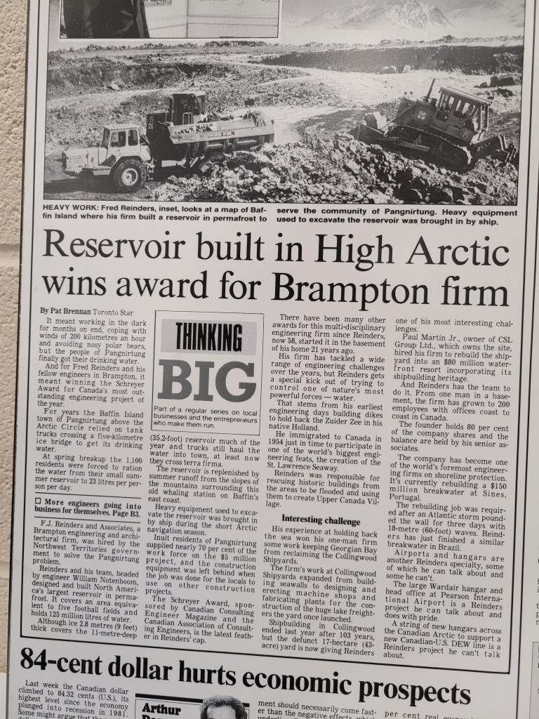 Born in 1930 Friesland, Fred Reinders was a dreamer, a visionary, and a leader, and he expressed that gift first of all through engineering design and construction. The Dutch have a proverb, roughly translated, that says “You can never cross the ocean until you have the courage to lose sight of the shore.” Well, Fred left the shores of his native Netherlands in 1953 to see what opportunities lie in Canada and it seems his life was a series of calculated risks from there on. He had training in marine engineering, which he supplemented with a University of Toronto civil engineering degree in 1959, and then began an engineering company in his basement in 1967. In his lifetime he would help start over 30 different companies.