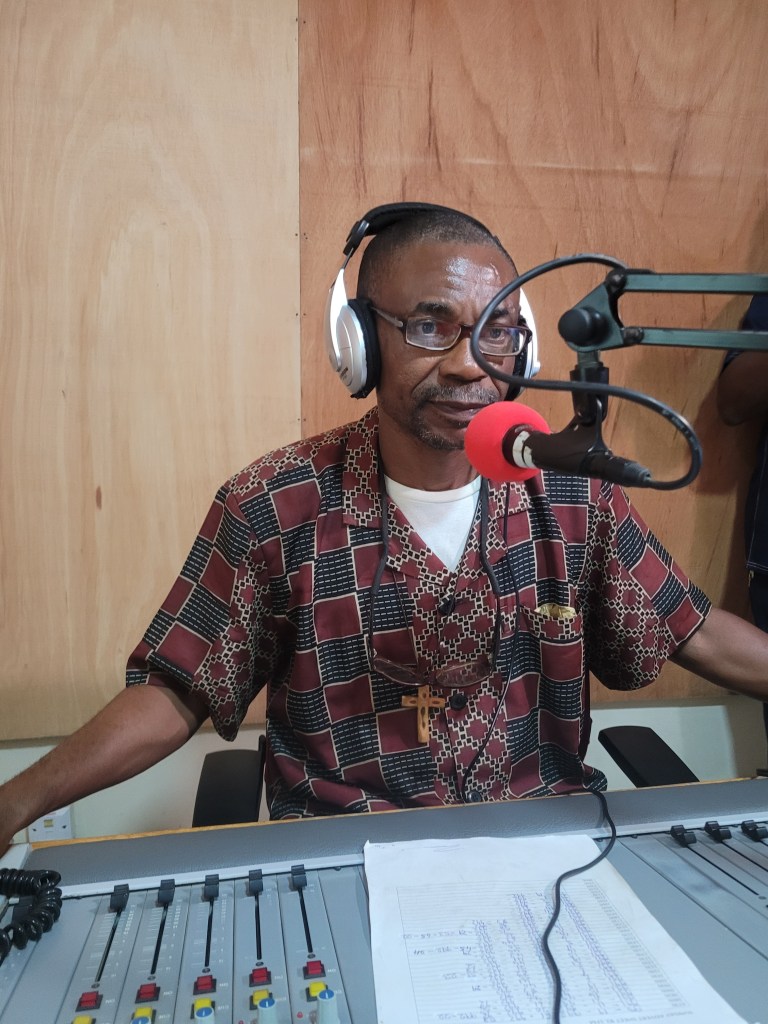 Pastor Benjamin Michael hosting a Christian show on the radio in The Gambia, West Africa. He promotes the work of the church and our Christian Religious Studies program at the university there.
