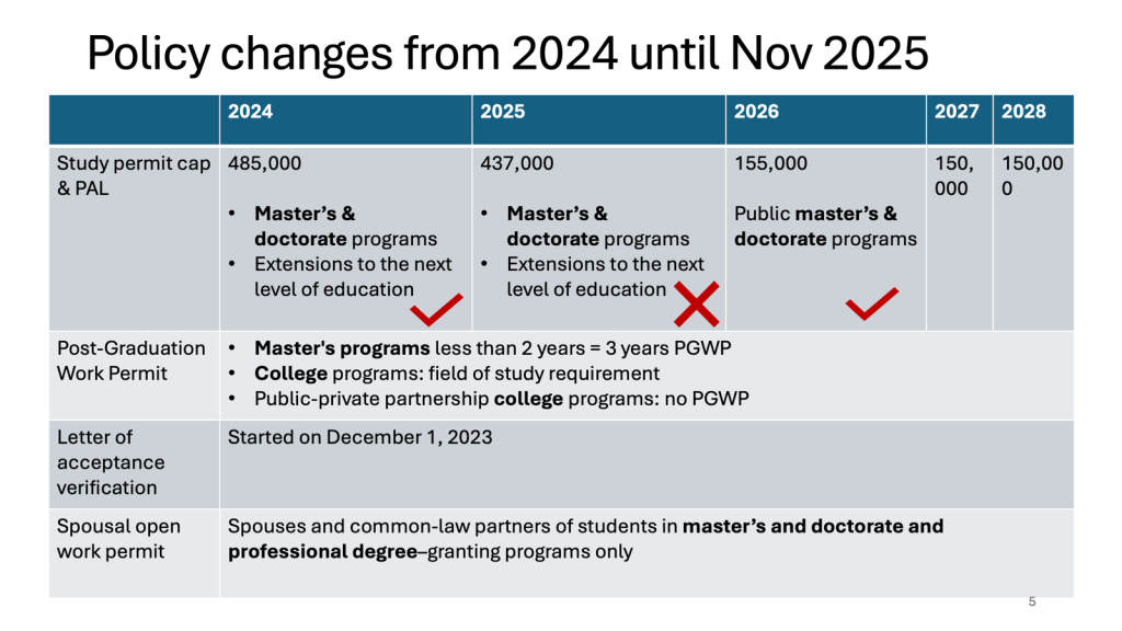 Yixin outlined the complex relationships international students must navigate: provincial Attestation Letters (PALs), federal study and work permits, university admissions and funding, and permanent residency pathways. Since 2023, IRCC has introduced major changes – verification systems, enrollment caps, and new restrictions that add layers of paperwork. “The new government direction seeks to restrict entry and tighten eligibility for international students,” she noted.